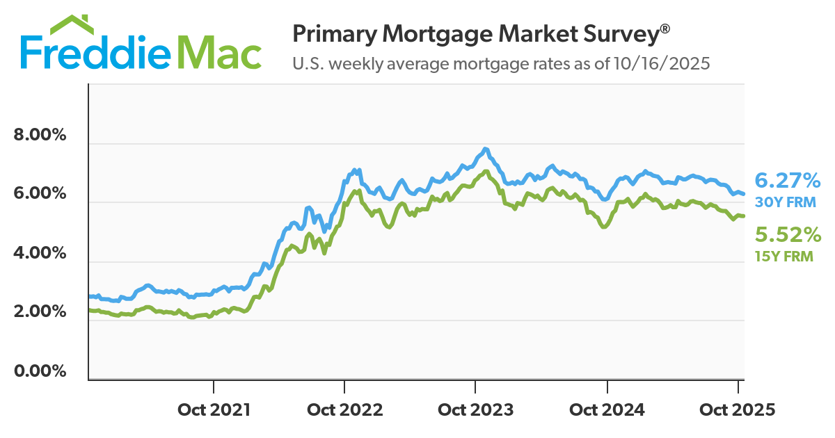 Freddie Mac graph of 15- and 30-year mortgage interest rates from October 2020 through October 2025.