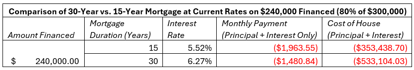 Table showing the monthly payment and total amount of principal and interest paid on a 15-year vs 30-year mortgage.